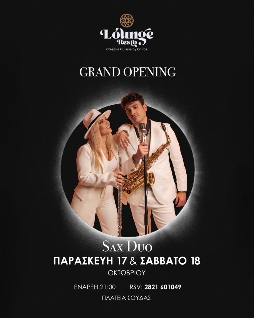 On Friday 17 and Saturday 18 October at 21:00, enjoy a unique musical journey with SaxDuo. A distinctive blend of saxophone and flute that effortlessly moves between bossa nova rhythms, jazz, lounge, and modern pop covers. Εstella Kopanou and George Panteloglou, two talented musicians with an impressive stage presence, invite you to two evenings filled with passion, rhythm and captivating sounds.