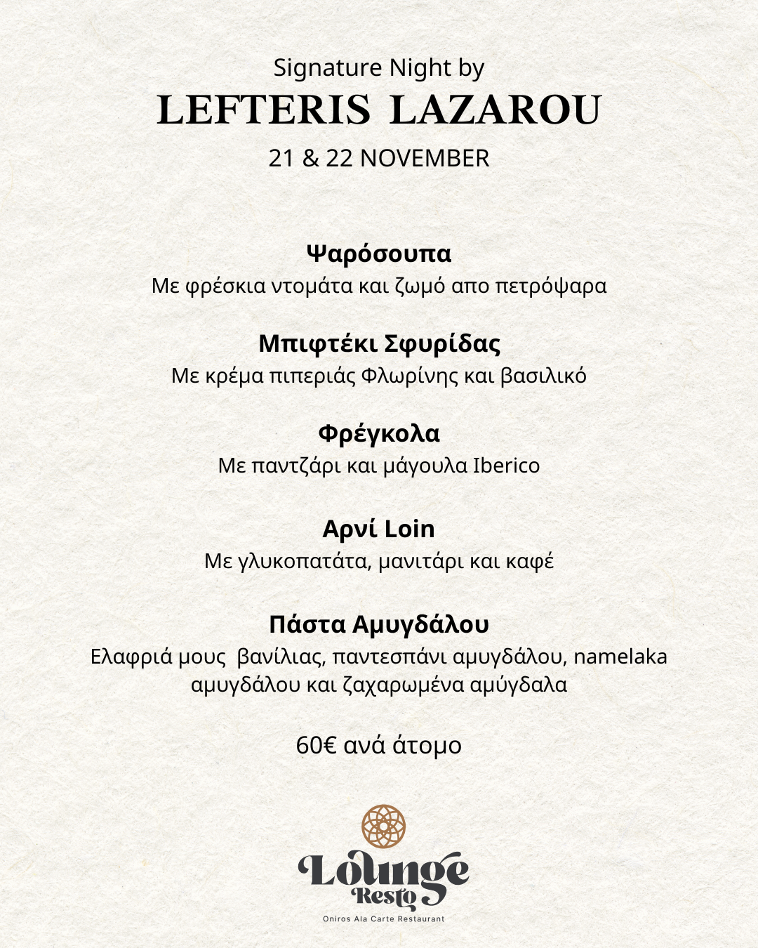 On Friday, November 21st, and Saturday, November 22nd, at 21:00, Michelin-starred chef Lefteris Lazarou returns to Oniros Lounge Resto for two more evenings of exceptional gastronomy. An exclusive experience where creativity meets tradition, through a menu personally crafted and presented by the chef himself, revealing the story and inspiration behind each dish. The evening will be accompanied by the musical duo Two Gents, featuring vocals and saxophone, adding an air of elegance and rhythm that enhances the dining experience. The distinctive philosophy of Lefteris Lazarou comes to life once again at Oniros Lounge Resto, offering two nights filled with flavor, sound, and unforgettable moments.