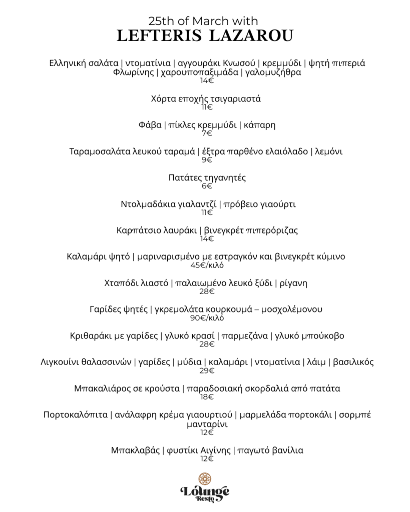 Την Τετάρτη 25 Μαρτίου στις 13:00, σας προσκαλούμε σε ένα ξεχωριστό γαστρονομικό μεσημέρι αφιερωμένο στην ελληνική παράδοση. Ο βραβευμένος με αστέρι Michelin σεφ Λευτέρης Λαζάρου δημιουργεί ένα εκλεπτυσμένο μενού εμπνευσμένο από τη θάλασσα και τις αυθεντικές γεύσεις της ελληνικής κουζίνας. Μια ξεχωριστή γαστρονομική εμπειρία αφιερωμένη στην ημέρα της 25ης Μαρτίου.