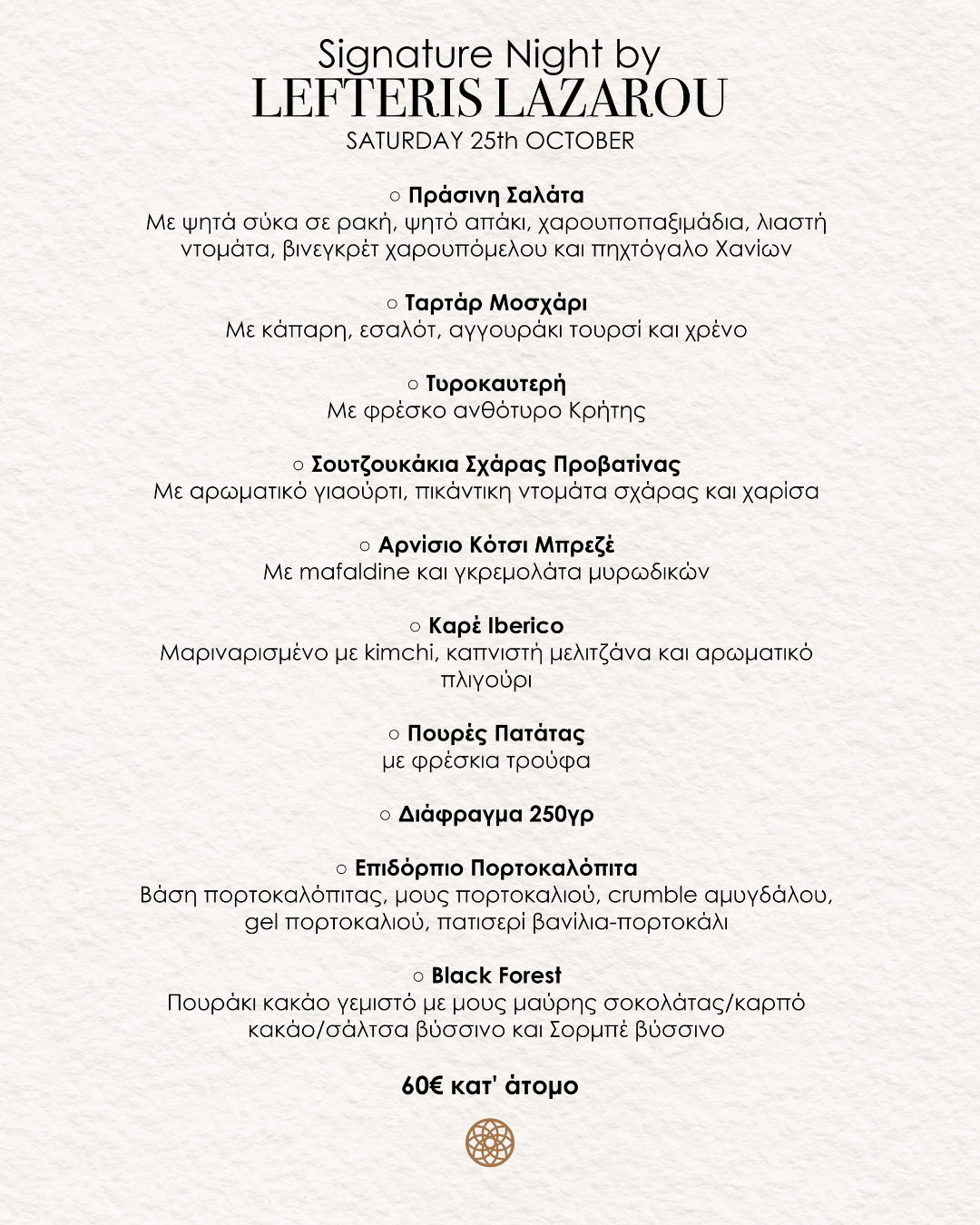 Μέσα από ένα ειδικά διαμορφωμένο μενού που έχει επιμεληθεί προσωπικά ο Λευτέρης Λαζάρου, οι επισκέπτες θα απολαύσουν δημιουργικά πιάτα και εκλεπτυσμένες γεύσεις. Ο ίδιος θα βρίσκεται εκεί μοιράζοντας με τους επισκέπτες την ιστορία και την έμπνευση πίσω από τις δημιουργίες του. Πρόκειται για μια μοναδική ευκαιρία για τους φίλους της γαστρονομίας να γνωρίσουν από κοντά τον κορυφαίο σεφ και να μοιραστούν μαζί του το πάθος και την αγάπη για τη δημιουργία μοναδικών γεύσεων.