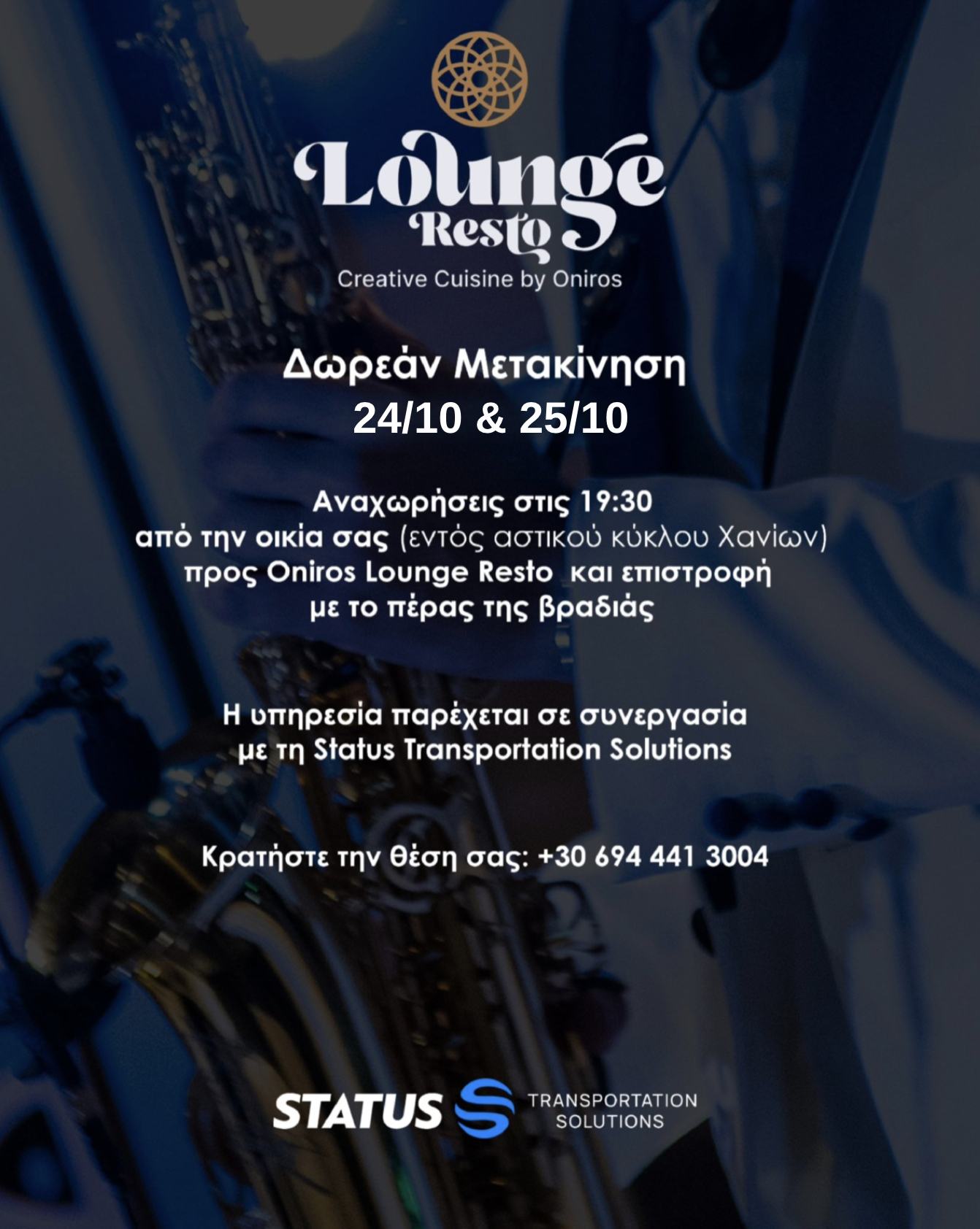 Με γνώμονα την ασφάλεια, άνεση και την εξυπηρέτηση των επισκεπτών μας, ανακοινώνουμε ότι για τις δύο βραδιές (24/10 & 25/10) θα προσφέρουμε δωρεάν μετακίνηση. Οι αναχωρήσεις θα πραγματοποιούνται στις 19:30 από την οικία κάθε επισκέπτη (εντός της πόλης των Χανίων) προς το Oniros Lounge Resto , ενώ η επιστροφή θα γίνεται αμέσως μετά το τέλος της εκδήλωσης στις 01:30. Η συγκεκριμένη πρωτοβουλία, που υλοποιείται με την υποστήριξη της Status Transportation Solutions, εξασφαλίζει στους επισκέπτες άνετη και ασφαλή μετακίνηση.