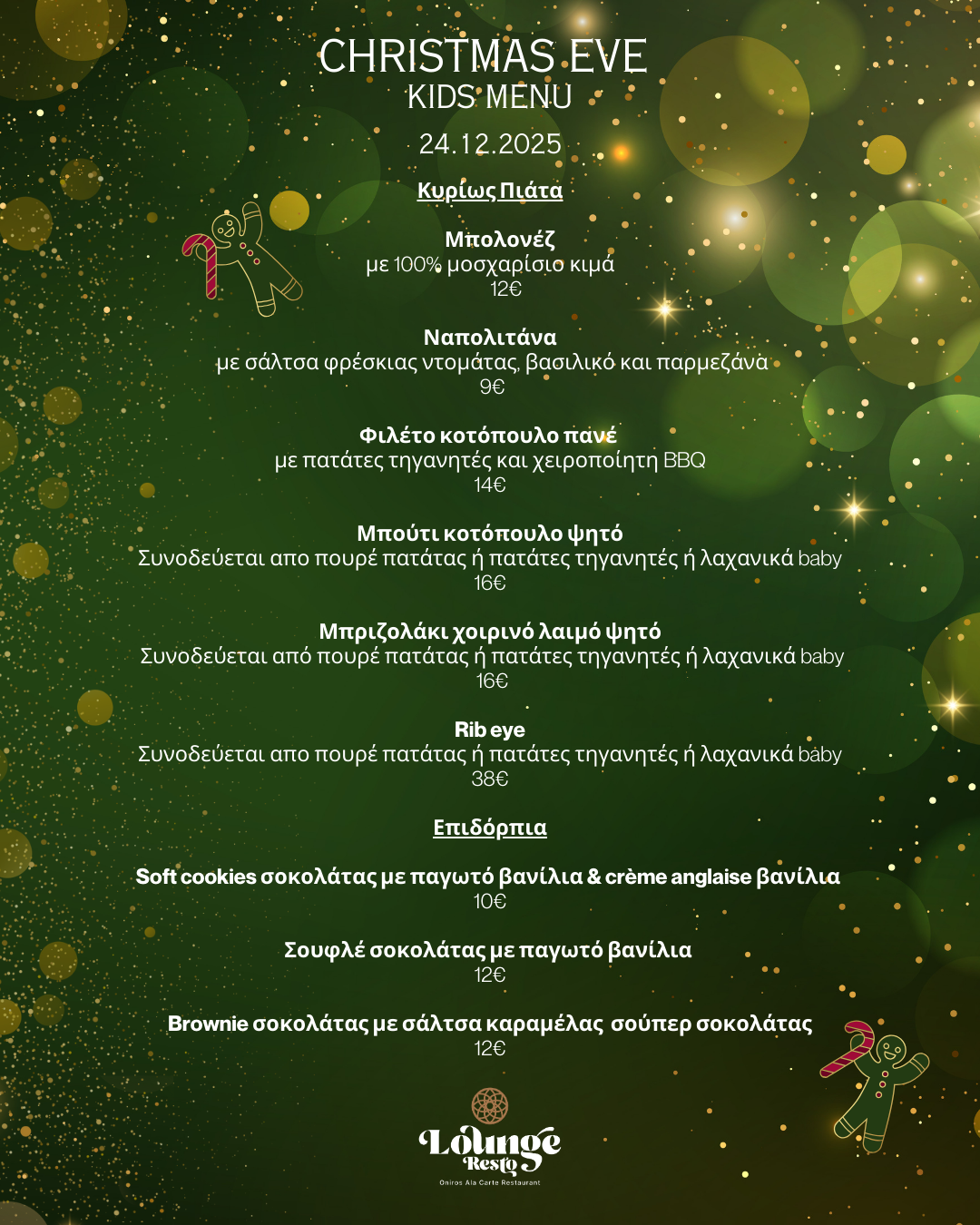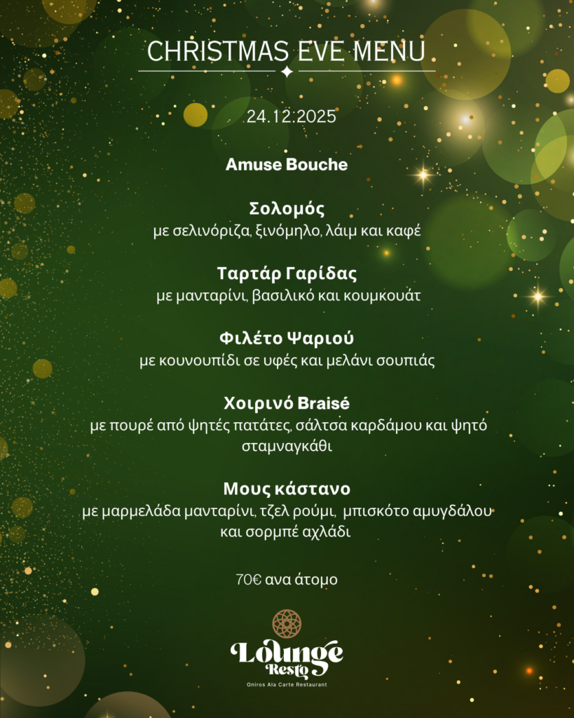 Μια ζεστή χριστουγεννιάτικη βραδιά με ιδιαίτερες γεύσεις και live μουσική από την Εστέλλα και τον Γιώργο Παντέλογλου, σε ένα ρεβεγιόν που κάνει την Παραμονή των Χριστουγέννων, 24 Δεκεμβρίου στις 21:00, μοναδική. Η βραδιά περιλαμβάνει ειδικό set menu για ενήλικες, ενώ υπάρχουν και ξεχωριστές επιλογές αποκλειστικά για παιδιά, ώστε όλοι να απολαύσουν την εμπειρία.